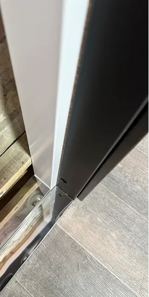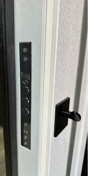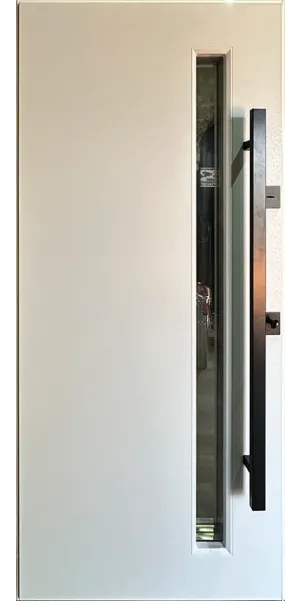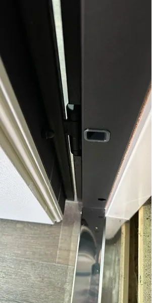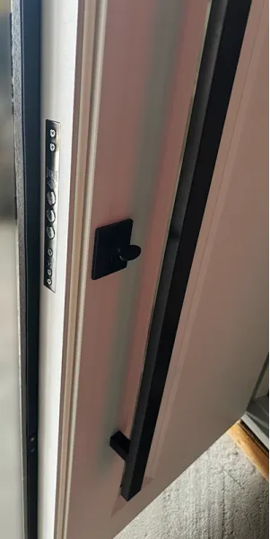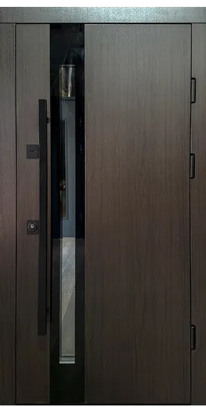 Фурнитура • 3 внешние петли, антисрезы, ручка на розетке, утопленная броненакладка, терморазрыв на раме( пробка 4 мм), эксцентрик, порог из нержавеющей стали