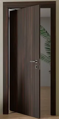 Каркас полотна виготовляється з євробруса (власної сушки), який покривається МДФ накладками товщиною 20 мм, після чого полотно покривається полімерним шпоном (екошпон), який ідеально імітує структуру натурального дерева. Це технологічний, екологічно чистий багатошаровий матеріал нового покоління, який не поступається нічим натуральному шпону і має ряд переваг. У цьому матеріалі дуже багато варіантів відтінків. Покриття на полотно наноситься на всі 360° - це придає йому більшу вологостійкість і дозволяє встановлювати такі двері у приміщення з підвищеною вологістю повітря, наприклад санвузли і кладовки. Це особливо актуально для невеликих житлових кімнат. Короб дверного блоку виготовляється суцільним на всю ширину стіни - завдяки цій технології немає необхідності докуповувати і додатково встановлювати добірну планку. Врізка петель і механізму проводиться на професійному обладнанні при виготовленні дверей, завдяки цьому при монтажі не потрібно виконувати даний вид робіт. В результаті приміщення залишається чистим після монтажу таких дверей.